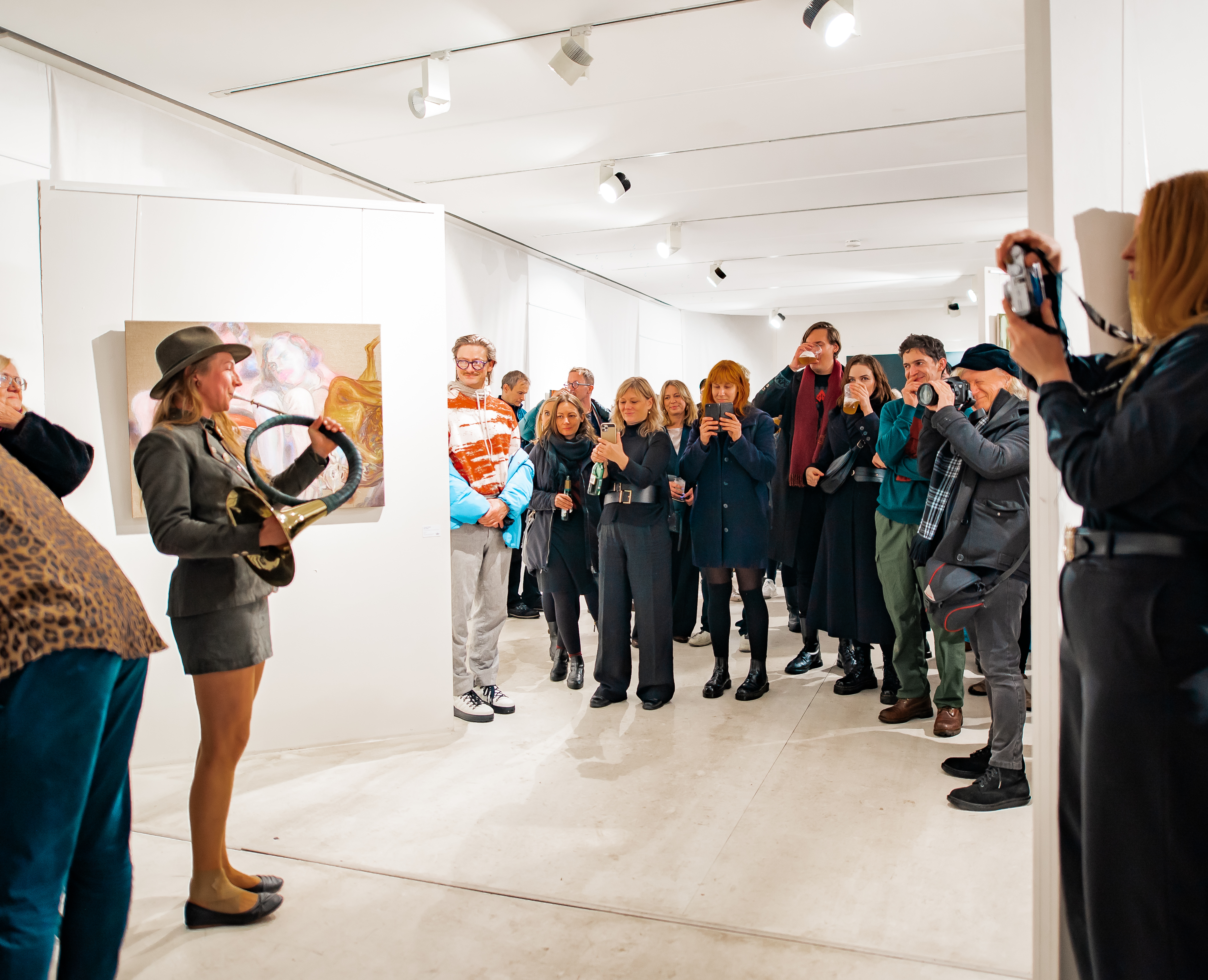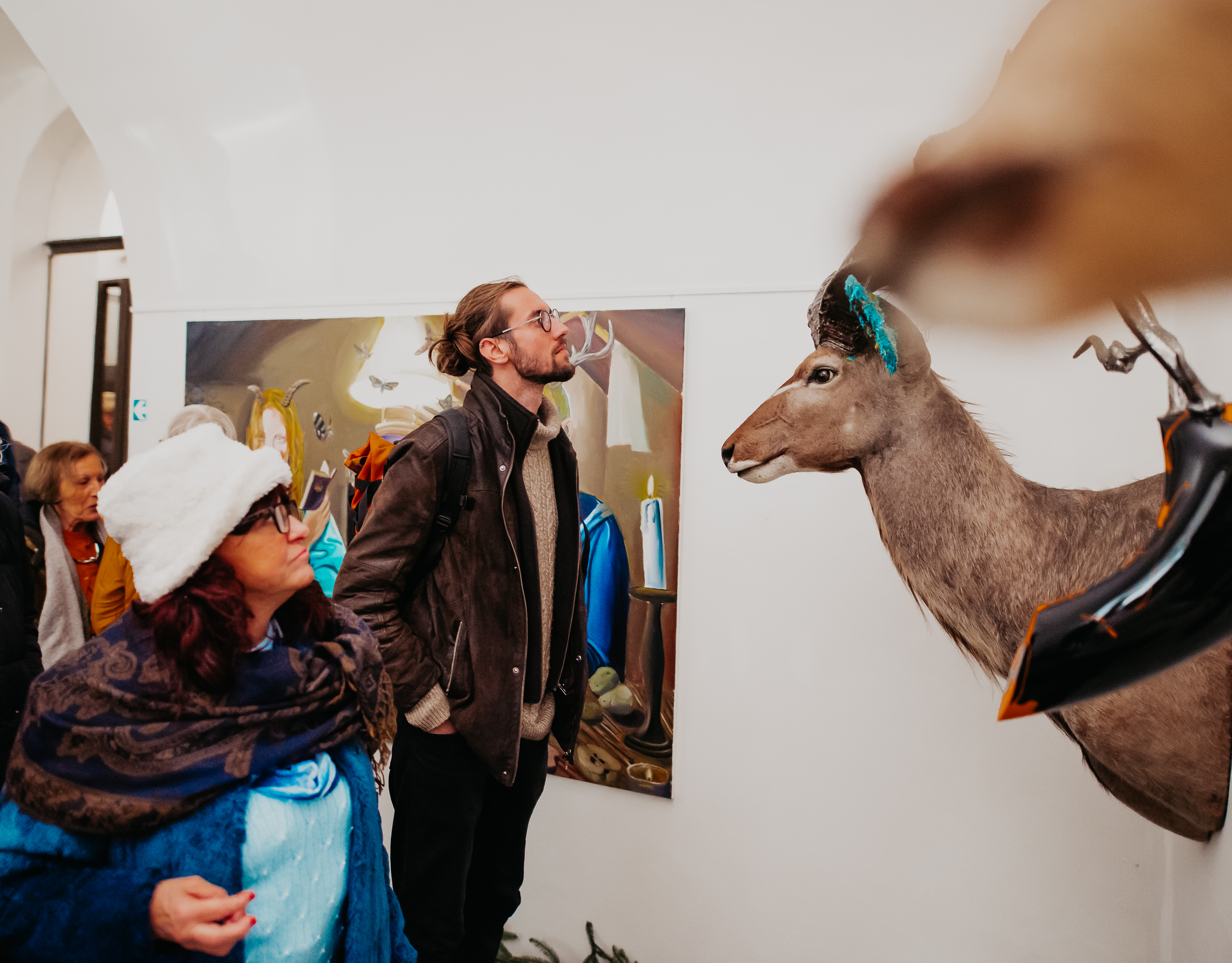 Some of the exhibiting artists express the topical motif through imaginary worlds and mythological themes. Hunting is in fact the oldest subject in art, as depicted in the earliest prehistoric paintings found in the Altamira and Lascaux caves, and has remained relevant to date, albeit in a less clear form where the roles of the hunter and the hunted are blurred. In the chaos of our precipitous era pushed by rapid technical developments, such as the AI (now available to the general public), it is increasingly difficult to distinguish between genuine art and machine-gen- erated images whose creators need not be skilled in any artistic technique.