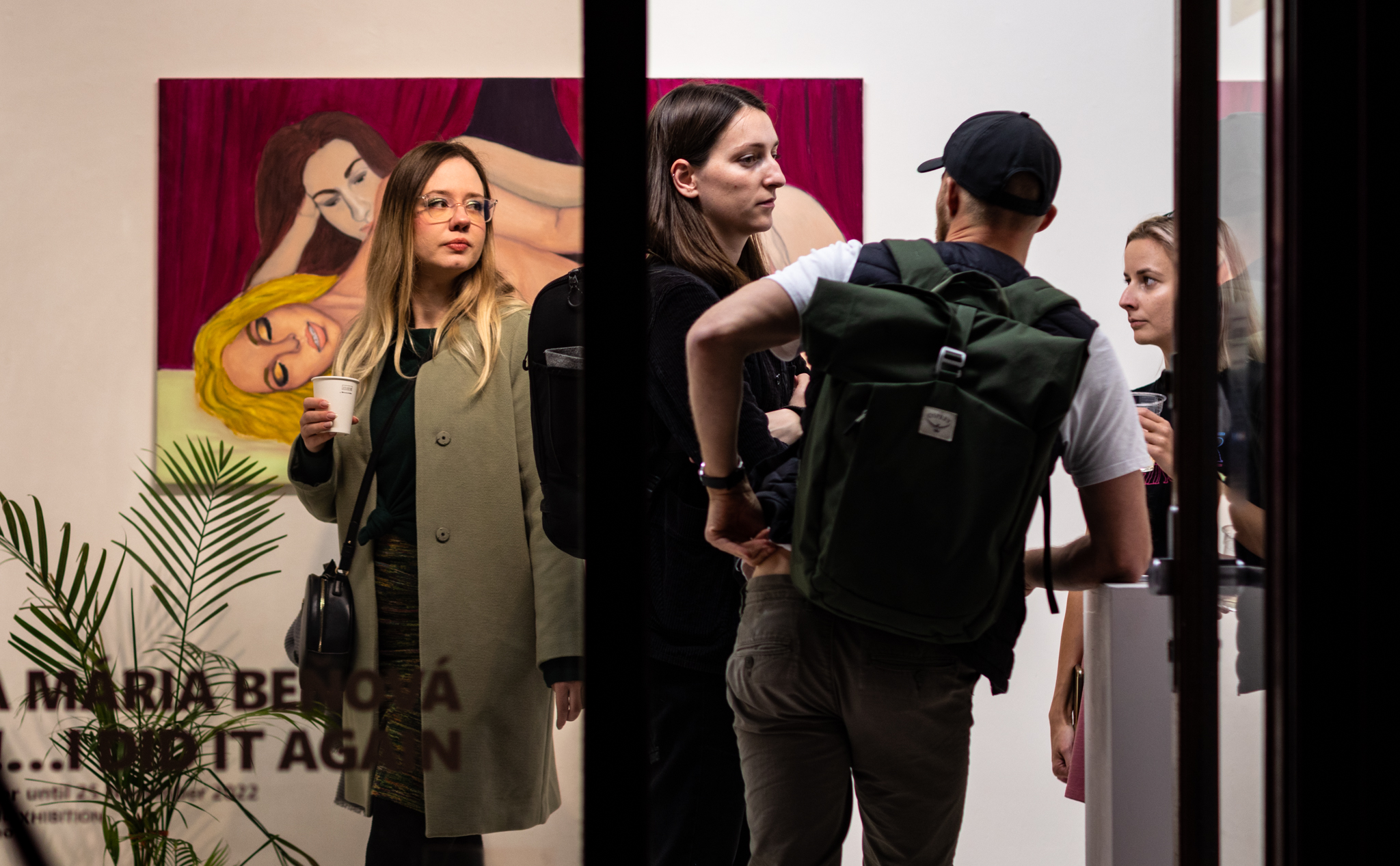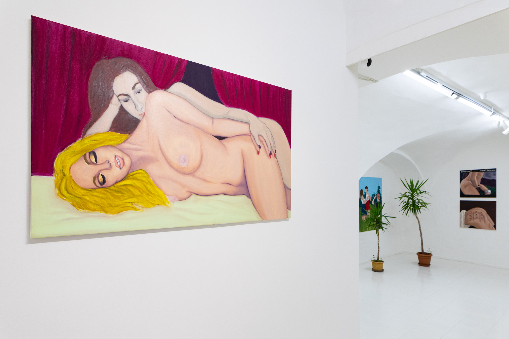 Oops!…I Did It Again is a solo exhibition by Anna Mária Beňová, who reflects the constellation of relationships between women and men, experiencing love in its various manifestations. The author puts actresses in different positions and explores what else they can handle. She tries to achieve a level of perspective focused on the perception and experience of female protagonists, their position, in relation to male characters on canvases. Vivid colorfulness is combined with humor and irony.