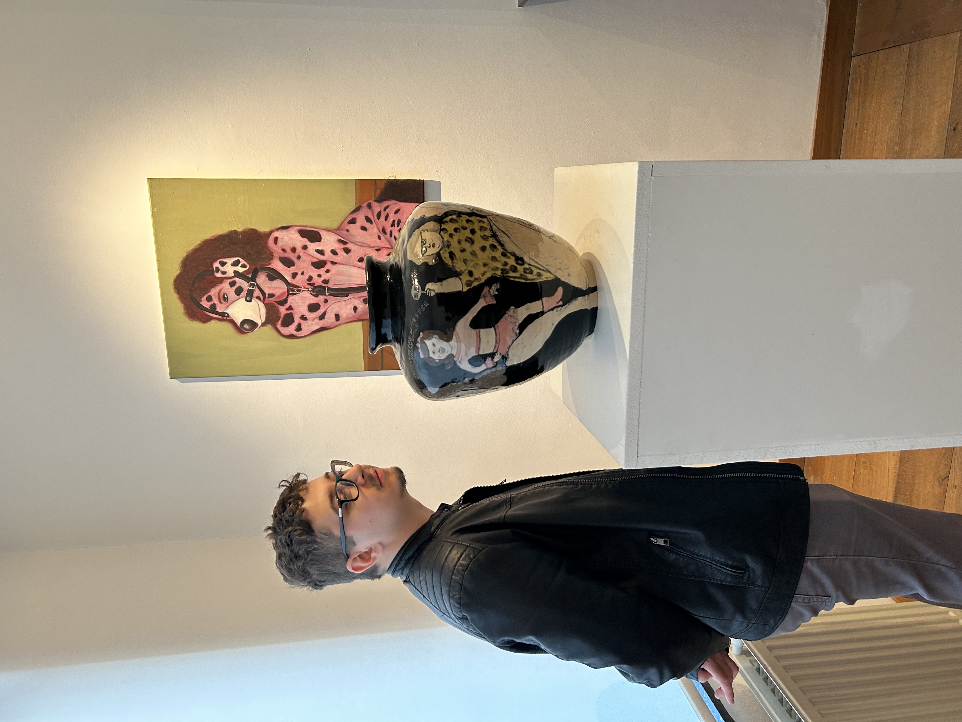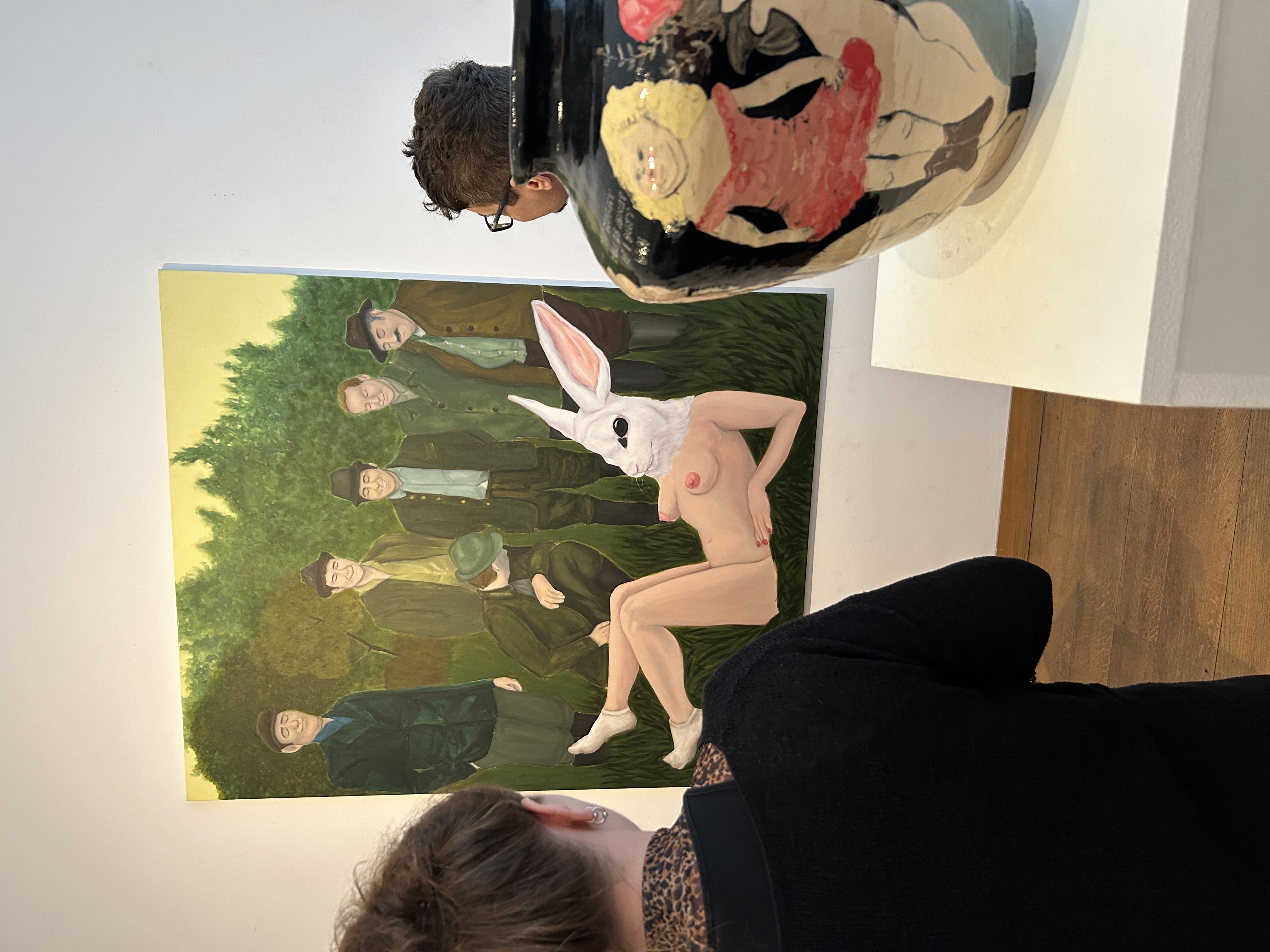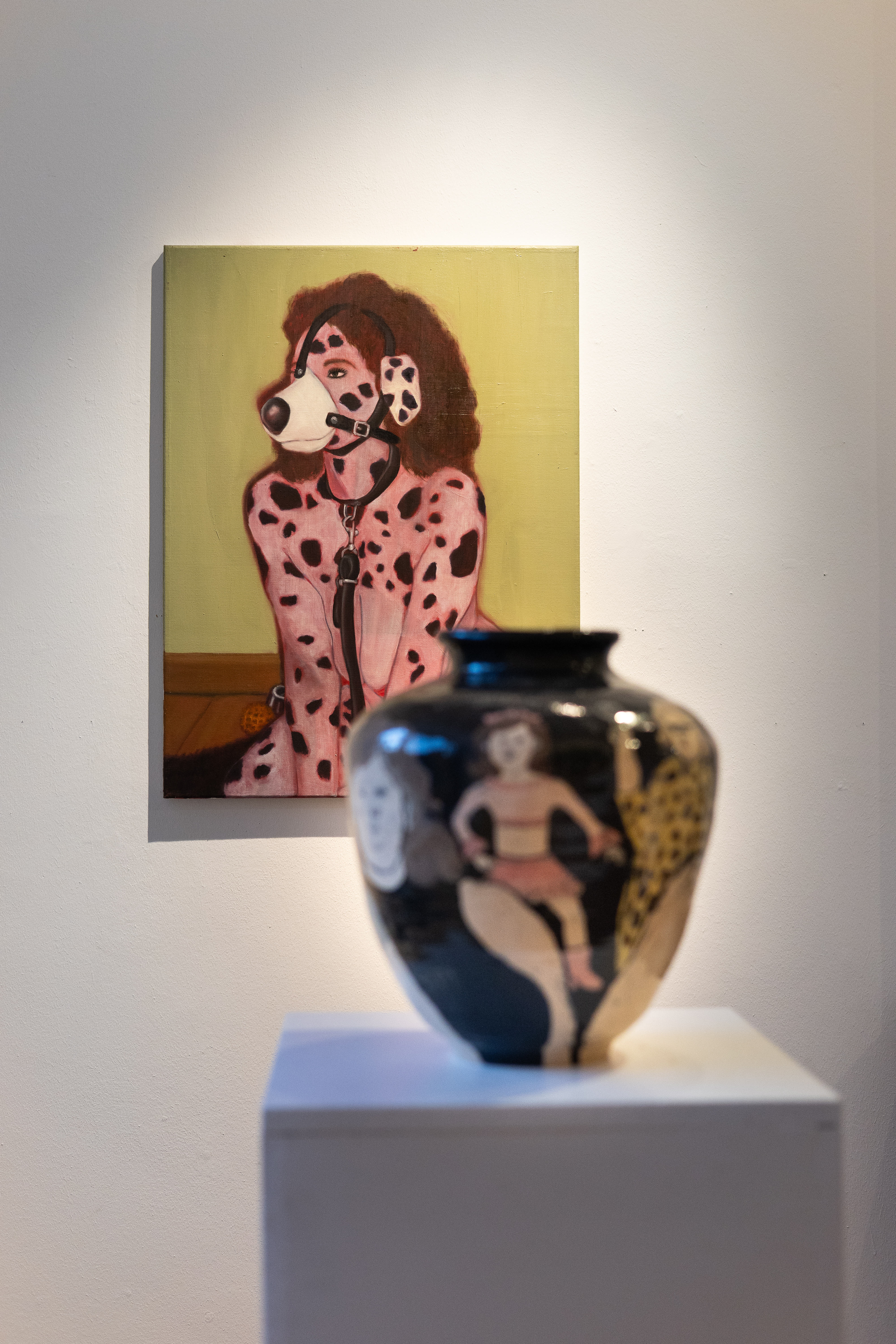 Zuzana Svatik's ceramics are cut from the same cloth, so to speak, as her colleague's paintings. Couples entangled in awkward lovemaking ("They fucked up the situation," she titles it) or unsettling motifs on everyday objects.
