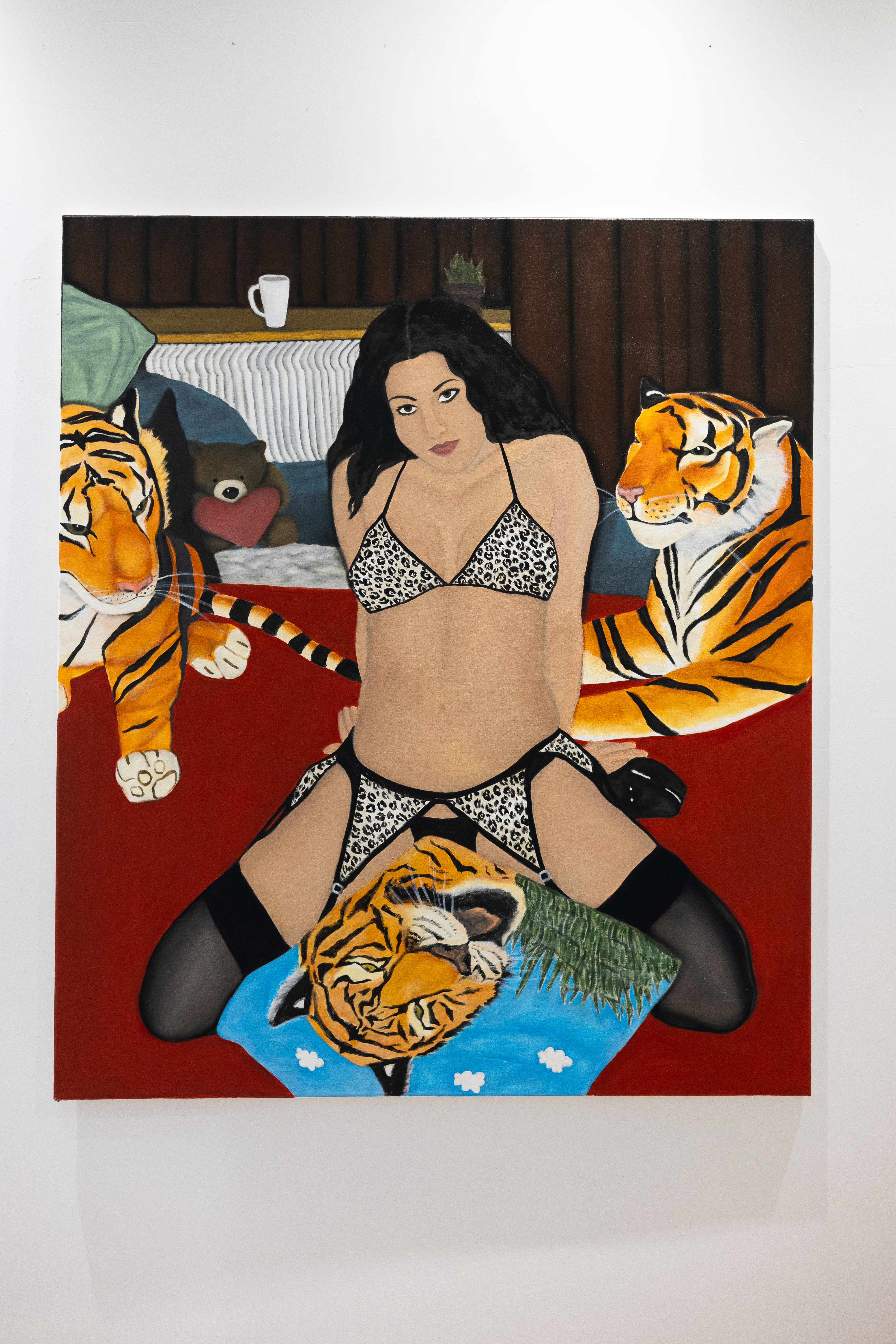 More cats; kittens and very large cats. Panthers, tigresses, a spotted woman and a bride on a leash, feline and cuddly women, trying to juggle all the codes and tragicomic poses one must master to please. Then we notice that teddy bear holding a heart in its paws, in the background…
